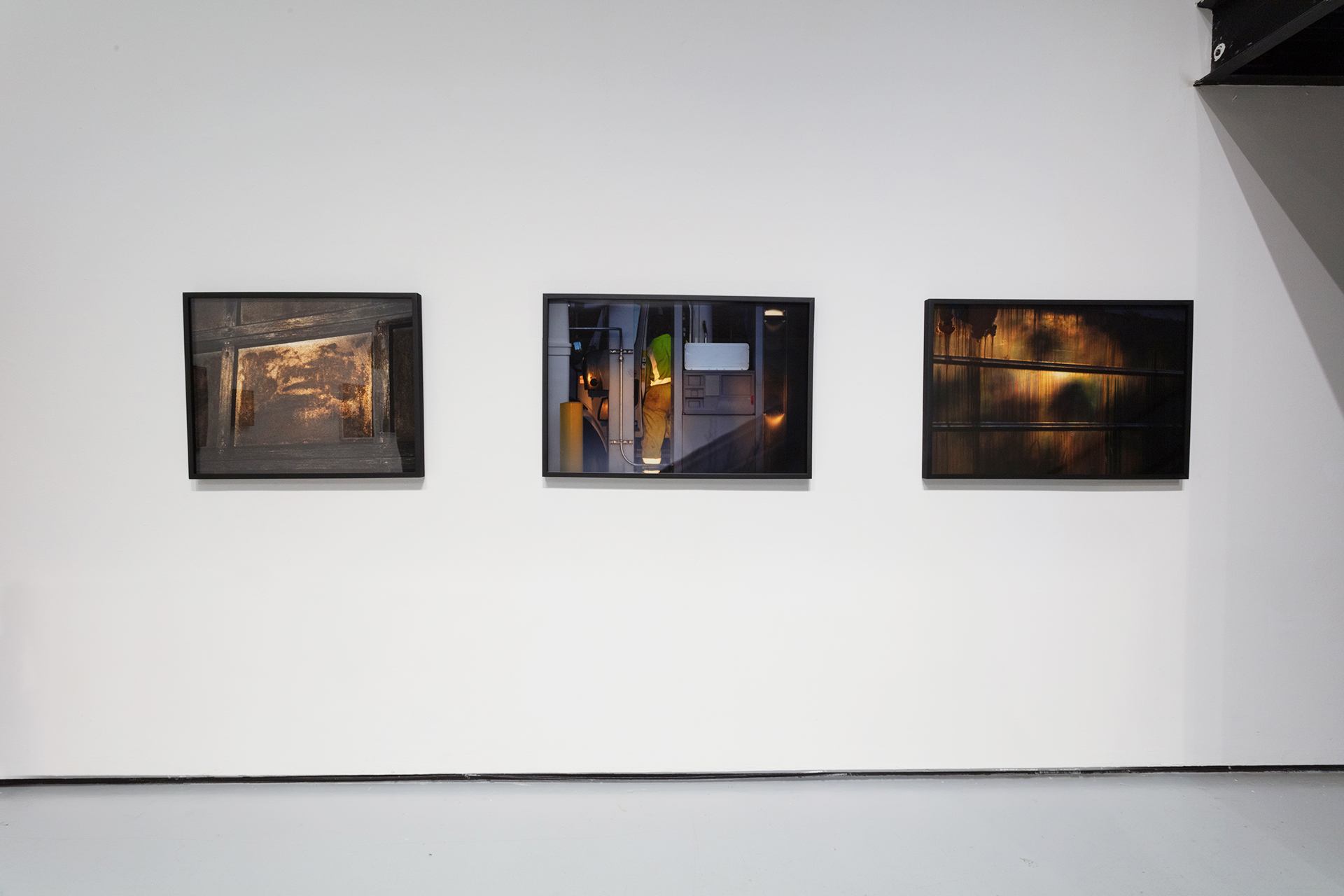 [left] Untitled (Garage Door), 2021, 26 x 32.5" inches, archival pigment print. [middle] Opened Door, 2021, 26 x 39", archival pigment print. [right] Truck Surface #2, 2020, 26 x 39", archival pigment print.