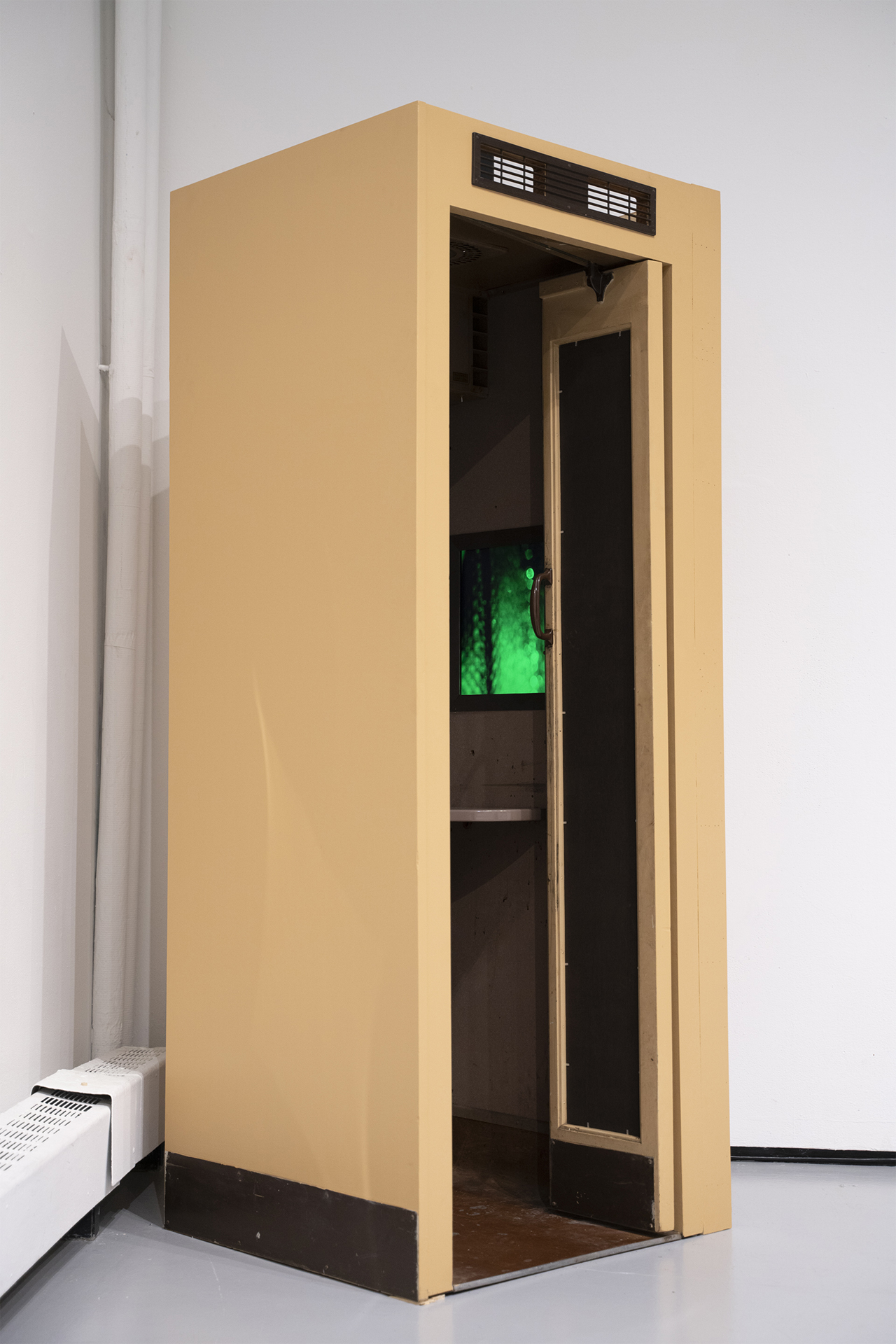 Channel 17 in Booth, 2021, single channel digital 4K video with sound, runtime: 7:53, looped, refurbished telephone booth, HD monitor, soundbar, subwoofer.