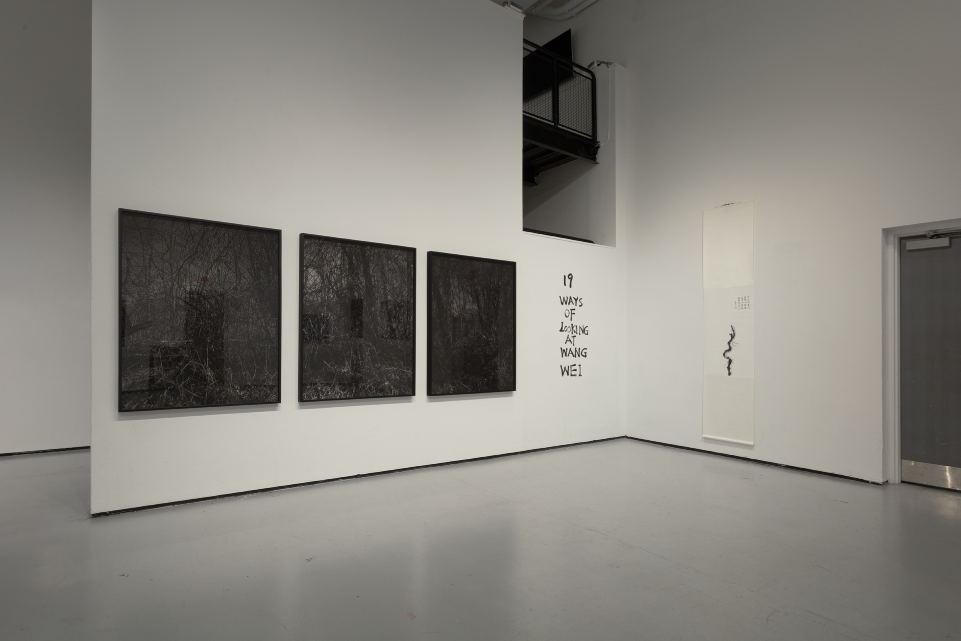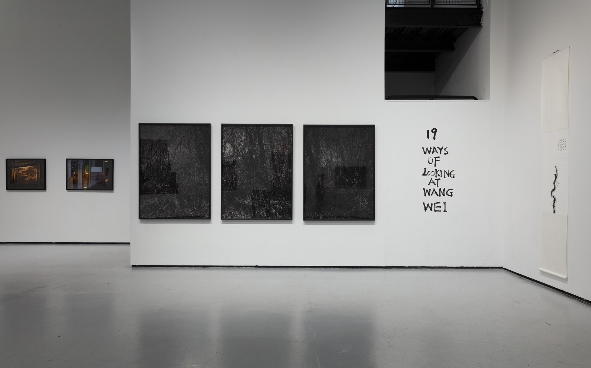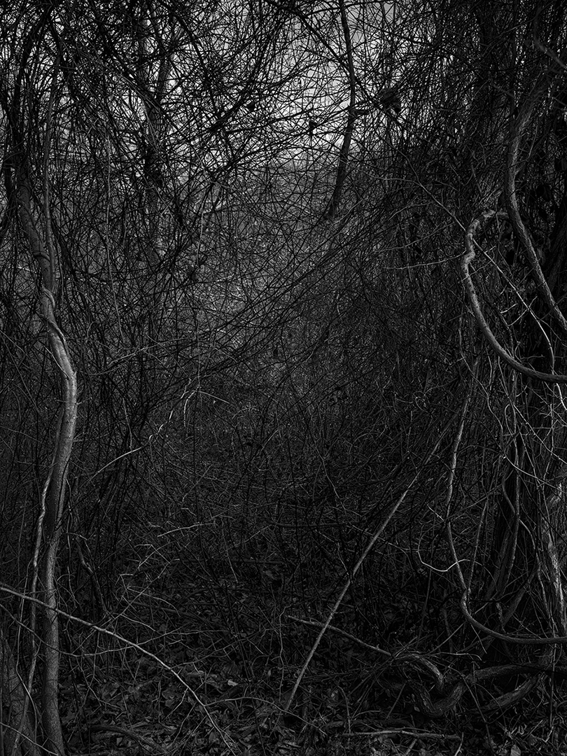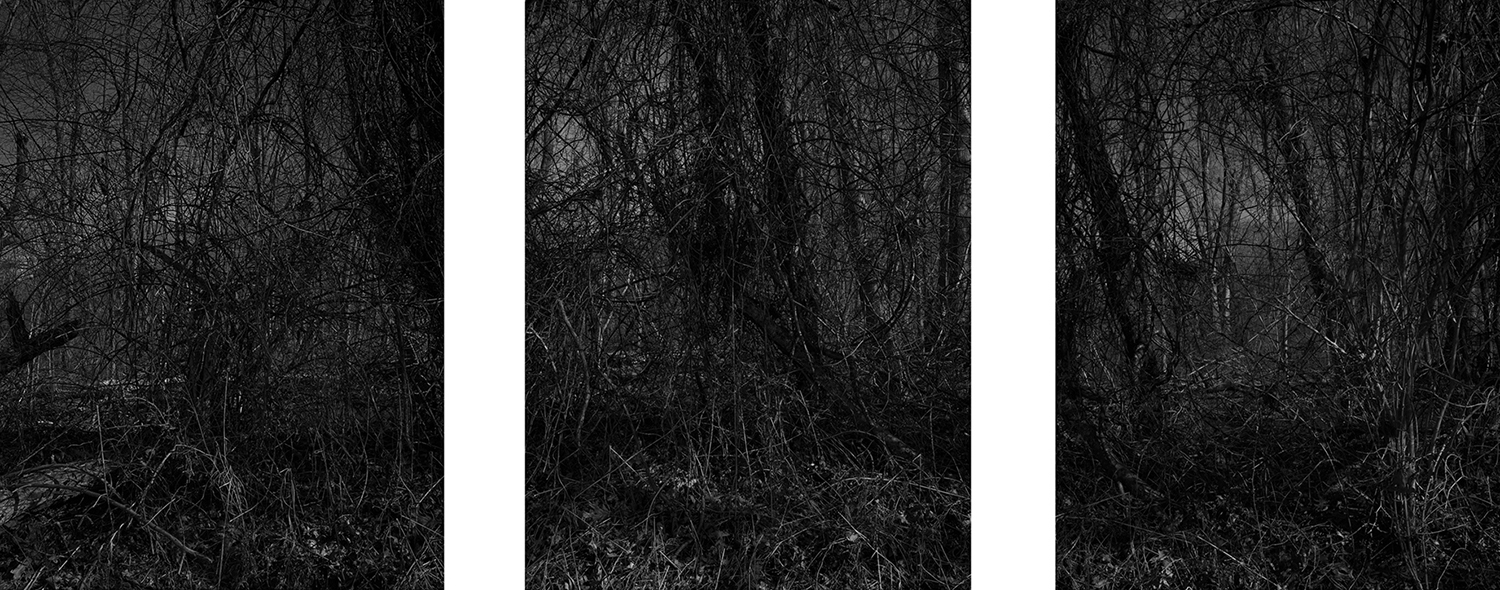 The assemblage consists of three sizable photographic panels. From right to left following the visual tradition of a Chinese handscroll painting, each view is a continuation of the previous scene of a shadowy landscape. At first glance, the branch-filled space appears to have blocked our way of entering the pictorial space. We are not given sufficient clues to unravel the world of entangled weeds and twigs, and there is no one in the woods with whom we can identify. The darkness and loneliness exuding from the photographs disorient our sense of space and time.